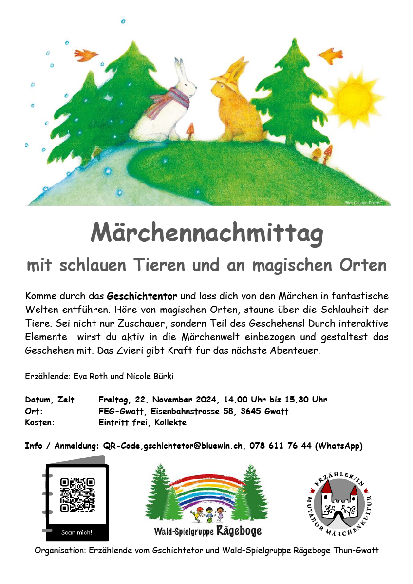 - Info/Anmeldung: QR-Code, gschichtetor@bluewin.ch, +41 78 611 76 44 (WhatsApp)